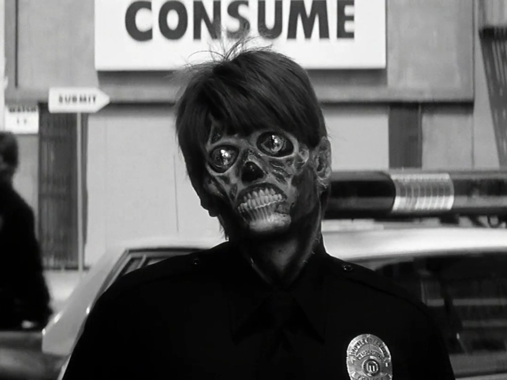 They Live follows a drifter named Nada (played by Roddy Piper) who stumbles upon a pair of sunglasses that completely change his perception of the world. Through these special lenses, he discovers that the wealthy elite are actually sinister, skull-faced aliens who control humanity through subliminal messages hidden in advertisements, TV, and money. As he uncovers the truth, Nada joins a small resistance group trying to expose the conspiracy and fight back against the alien overlords.